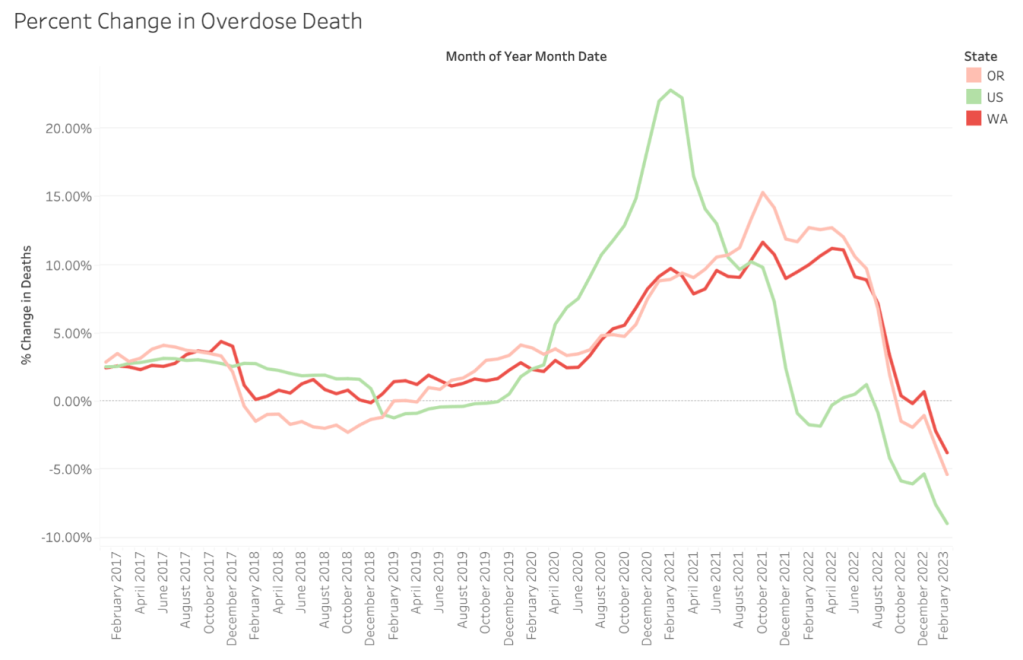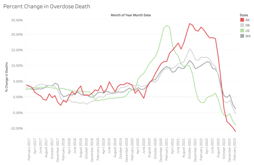 For the US overall, we see a rapid increase in overdoses that starts with the pandemic, peaks in early 2021, and has started to decrease by early 2022. For Oregon and Washington, overdose rates increase more slowly during the pandemic and peak in mid-2022. Overdose rates have started to decrease, but not until late 2022 and early 2023. This means that when the Atlantic says that Oregon’s overdose deaths have increased faster than the country as a whole, the missing context is that prior to the period in consideration, overdoses increased much faster for the US as a whole than they ever did Oregon.
