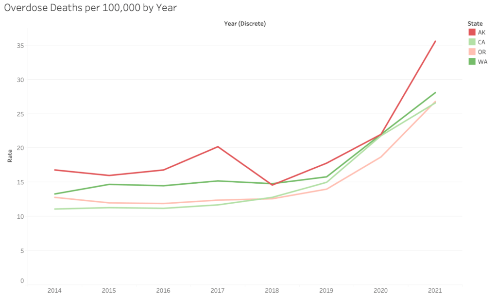 Notably, Alaska saw a 62% increase in overdose deaths in a single year, without any change in drug policy. The key takeaway here is that even independent of drug decriminalization, literally every state touching the Pacific Ocean saw sharp increases in overdose death per 100,000 people. Because we are seeing similar patterns in many states with different drug policies, this means that something else is going on! Two blindingly, blindingly obvious explantions are: