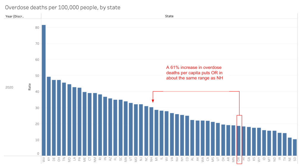So one important piece of context we can pull from this graph is that the 61% increase cited by the Atlantic takes Oregon from on the low end of states for overdose deaths to middle of the pack (assuming no other states saw increases. in overdose deaths, which is unlikely. There is a lot of overheated rhetoric about Portland in particular as a den of lawlessness in conservative media, and I do think that it is important to observe that at worst, even if decriminalization was definitely responsible for all of that increase, it has resulted in only an average amount of lawlessness (in at least this one dimension).