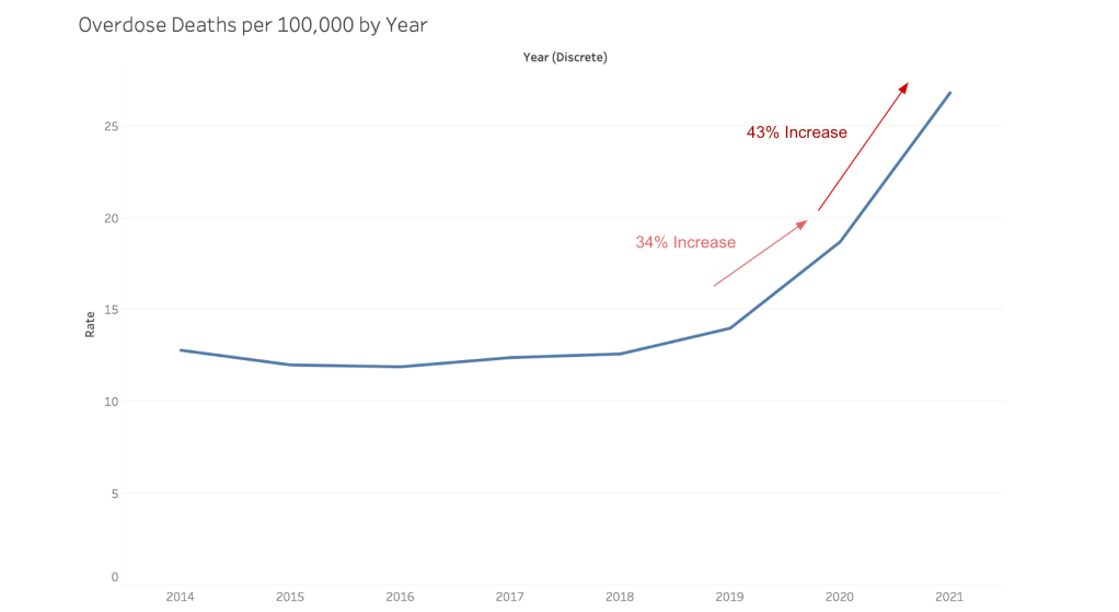 - The global coronavirus pandemic, which, uh, there was a lot of reporting at the time about how it was leading to increased substance abuse, and which pretty obviously correlates to the increase in overdose deaths.